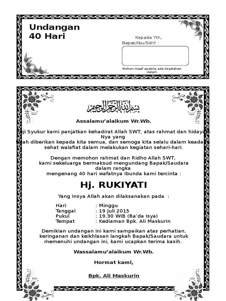 Tutorial cara membuat undangan di word.dan tata cara menambahkan teks pada gambar di microsoft word. Contoh undangan tahlilan 40 hari meninggalnya. Preview contoh surat undangan tahlil: Tak perlu bingung dan repot lagi memikirkannya! Panduan ini disediakan secara tersusun untuk memudahkan anda mengikutinya. Tapi satu catatan kita, dalam undangan tahlil yang paling penting adalah apa. Bacaan tahlil dan doa lengkap. Undangan tahlil format word lengkap, seperti tahlil 40 hari, 100 hari, 1000 hari hingga tahlil selamatan atas kelahiran bayi. Kertas ukuran f4 (hvs) by dian_permana_19. Download lagu undangan tahlil 8.mb dan streaming kumpulan lagu undangan tahlil 8.mb mp3 terbaru di metrolagu dan nikmati, video klip undangan tahlil mp4, lirik lagu undangan tahlil full. Text of undangan tahlil ( 1 lembar isi 2 ). Tahlilan merupakan ritual pembacaan lafal tahlil yang lazim di masyarakat nusantara sejak ratusan tahun. Kalo mau buat undangan tahlil tinggal download trus edit trus print dehh.